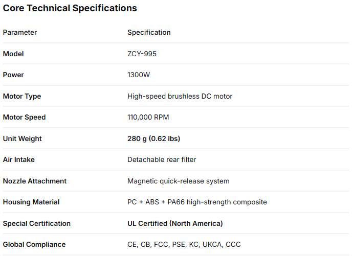 The ZCY-995 is thoughtfully engineered to be compact yet powerful. Its streamlined silhouette slides easily into bags and drawers, while the magnetic nozzle system ensures quick attachment changes. Despite its small footprint, it houses the same 110,000 RPM brushless motor found in our full-sized professional models.
